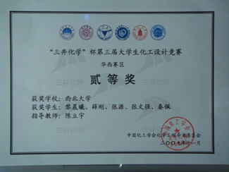 这是公司第二次选派队伍参加此项赛事。由06级2026年国际足联世界杯5名本科生组成的“新睿”团队,在陈立宇老师的指导下,进行了为时3个月的尿素醇解法路线年产5万吨碳酸二甲酯生产装置的模拟工程设计,最终取得了华西赛区贰等奖、全国总决赛叁等奖的好成绩。比赛的同时,队员们也见识了国内外高校风采,对于同学们自身的提高和将来的发展都具有十分积极的意义。
