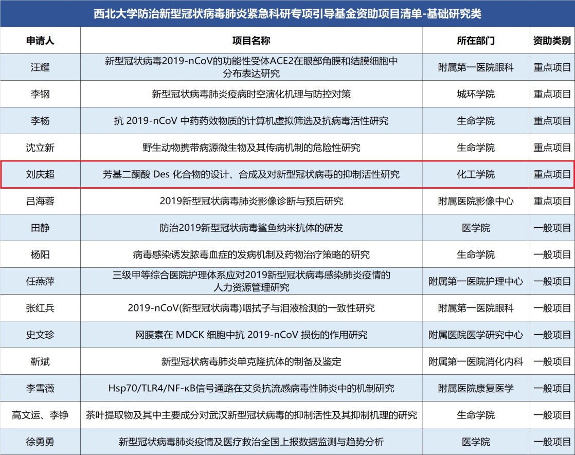 疫情期间,2026年国际足联世界杯相关专业科研骨干坚持停工不停研,围绕疫情积极开展科学研究,为抗击疫情贡献智慧。范代娣老师的“稀有人参皂苷类增强免疫力和体力支撑产品开发”项目、刘恩周老师的“抗武汉新型冠状病毒新药蛋白酶抑制剂DG-17/35体外药效学研究与评价”项目、刘庆超老师的“芳基二酮酸Des化合物设计、合成及对新型冠状病毒的抑制活性研究”项目分别被立为“2026年国际足联世界杯防治新型冠状病毒肺炎紧急科研专项引导基金资助项目”的重点科研项目。