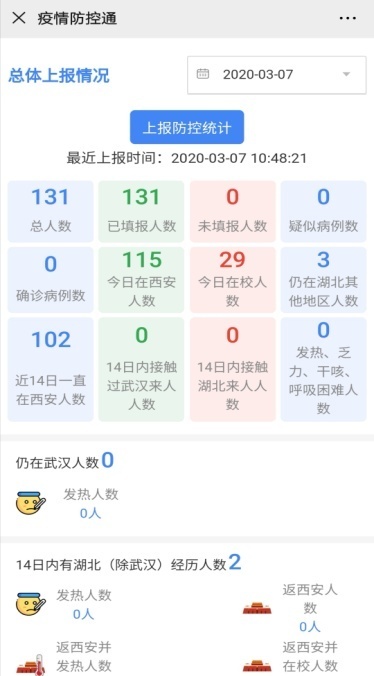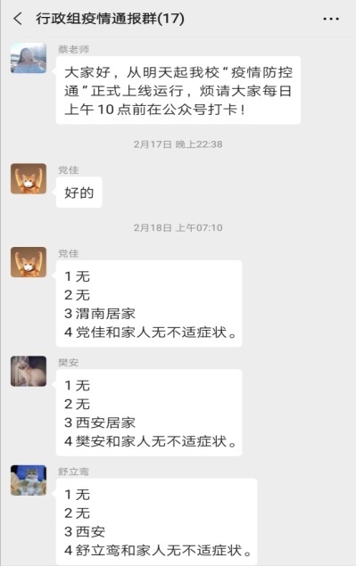 一是及时通过电话、微信等渠道,全面统计在职教工、离退休教工、教工家属、博士后、本硕博员工健康状况及出行信息,并落实到责任人。防疫期间,公司实行健康状况每日报告制,重点关注前往西安以外地区教职工及家属的相关信息,保持密切沟通。