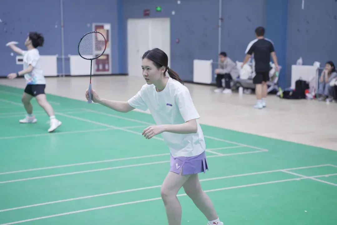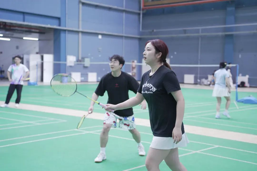 晨光初绽,羽毛球馆内已涌动起蓬勃朝气。四个公司的选手们早已就位。鞋胶与地板的摩擦声、球拍击球的脆响、电子计分器的滴答声,共同谱写出初夏清晨最激昂的序曲。