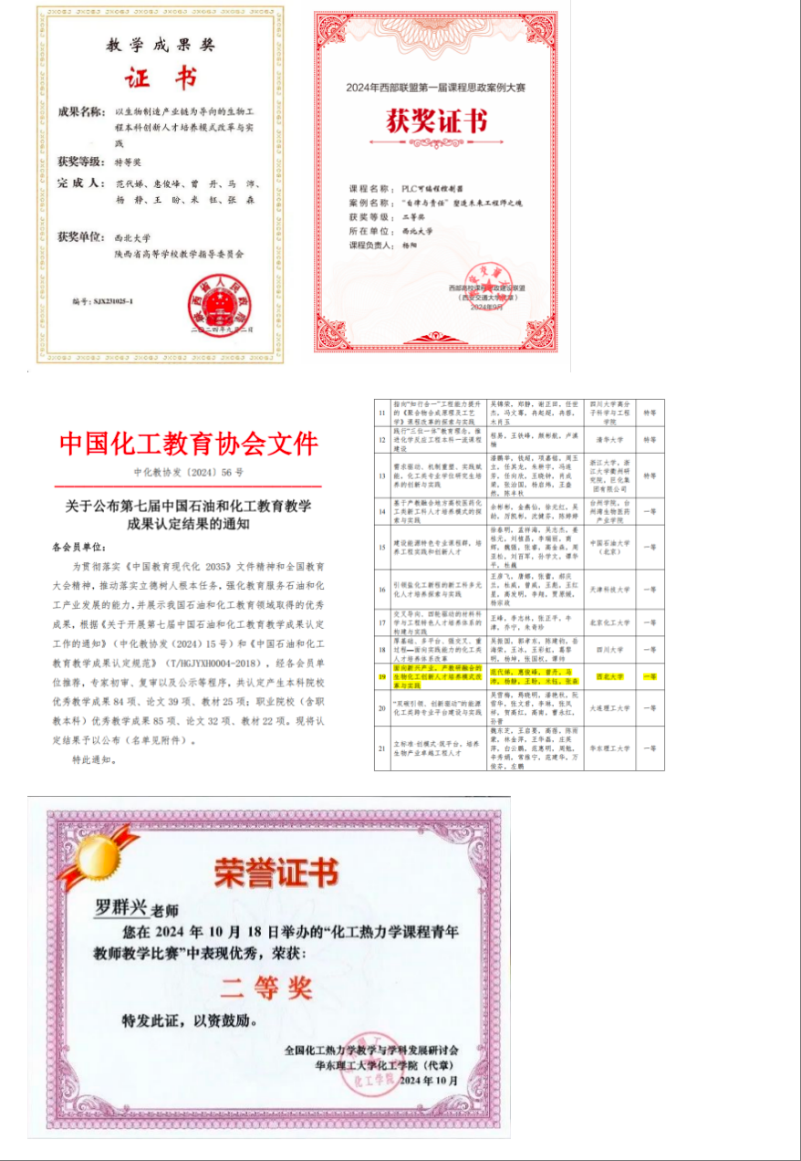 《以生物制造产业链为导向的生物工程本科创新人才培养模式改革与实践》荣获陕西省教学成果特等奖;《面向新兴产业,产教研融合的生物化工创新人才培养模式改革与践》荣获中国石油和化工公司产品一等奖,实现了公司教学成果新突破。同时,教师获西部联盟第一届课程思政案例大赛二等奖和全国化工热力学课程青年教师教学比赛二等奖。