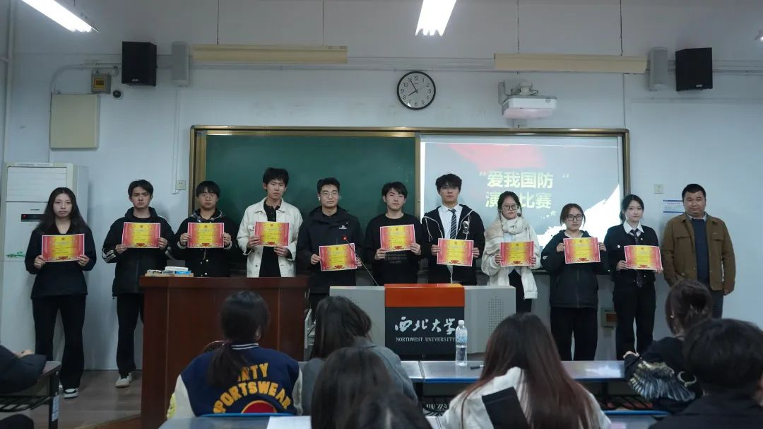 评委们从演讲内容、语言表达、情感投入、舞台表现等多个方面对选手进行了综合考量。他们认真聆听每一位选手的演讲,秉持公平、公正、公开的原则,为选手们打出了客观的分数。经过激烈的角逐,比赛结果终于揭晓。最后,由团委员工组织指导老师程路路老师为获奖同学颁奖并提出寄语,希望大家继续关注国防,也期待同学们可以发挥特长,用实际行动爱我国防。